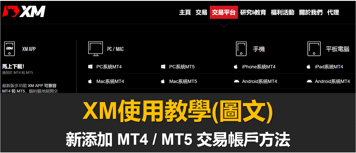 XM提供MT4、MT5及專屬行動端交易app。