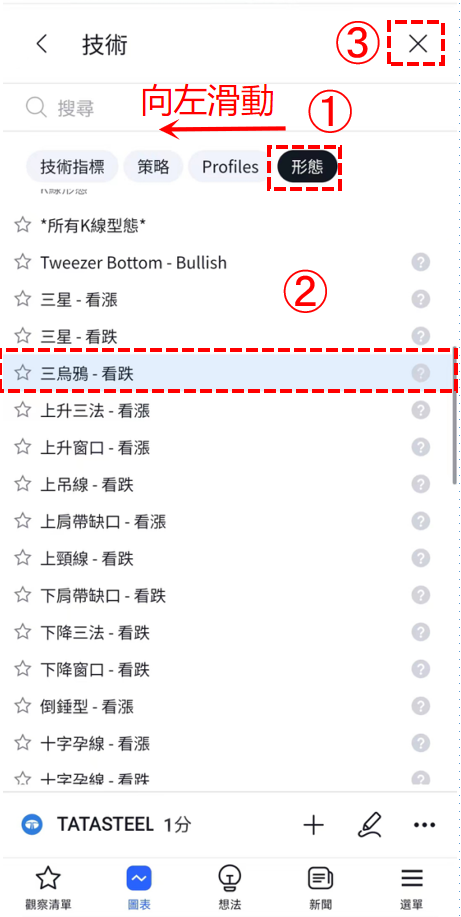轉移到「技術」介面後,將上面的標籖向左滑動到「形態」標籖,在列表中找到並點選「三烏鴉-看跌」指標。