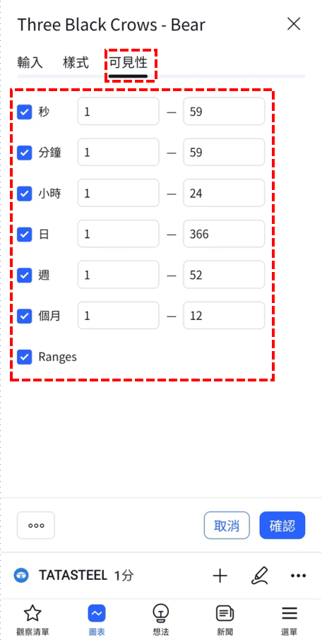 在「可見性」中,可以根據時間週期設置是否顯示「三烏鴉-看漲」。