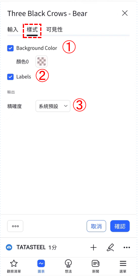在「樣式」中可以設置在檢測到「三烏鴉-看跌」位置的背景色和是否顯示標籖。